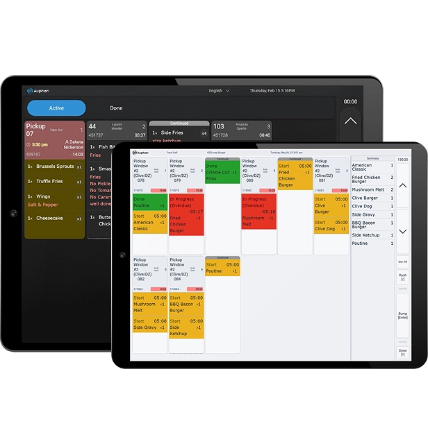 使用Auphan 的 KDS Bump 和 Expo Screen自定义票务布局、突出显示和分组项目、减少票务错误。查看多种语言并生成报告以跟踪车站状态等。提供深色和浅色模式。